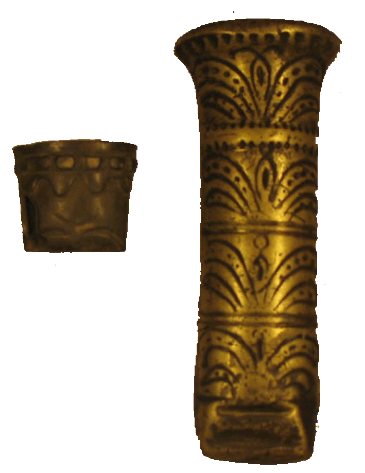 Описание: Вид цилиндра закругленного с концов. Цвет золотистый. Поверх выбиты узоры в виде цветов.