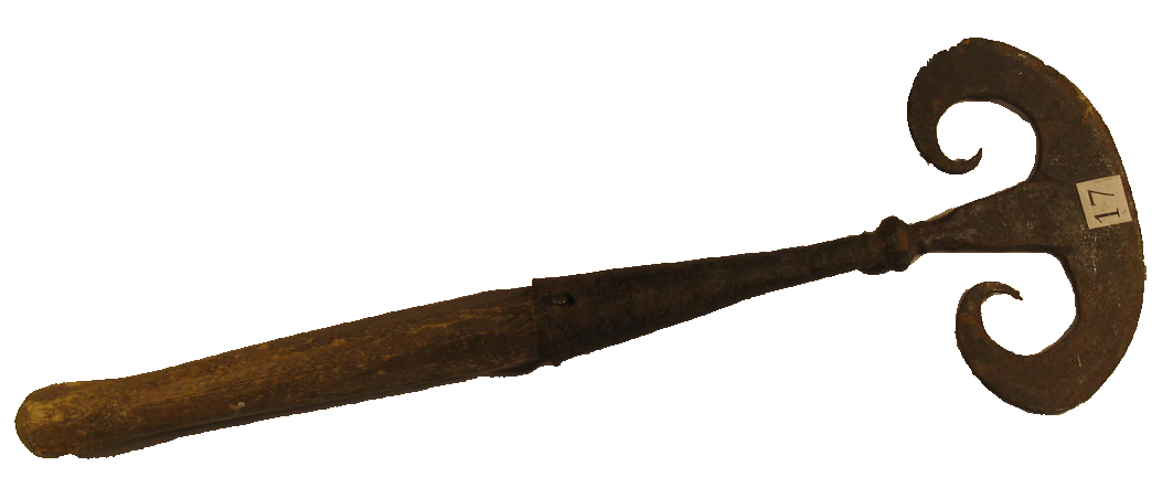 Описание: Изготовлена из дерева и железа. Ручка округлая в сечении, из дерева. С одной стороны заточена под конус и закреплена в конусообразной втулке железным гвоздем. Рабочая часть посередине имеет подпрямоугольный выступ, к которому прикреплена втулка. Рабочая часть изготовлена в форме неправильного круга, большую часть которого занимает округлое сквозное отверстие.
